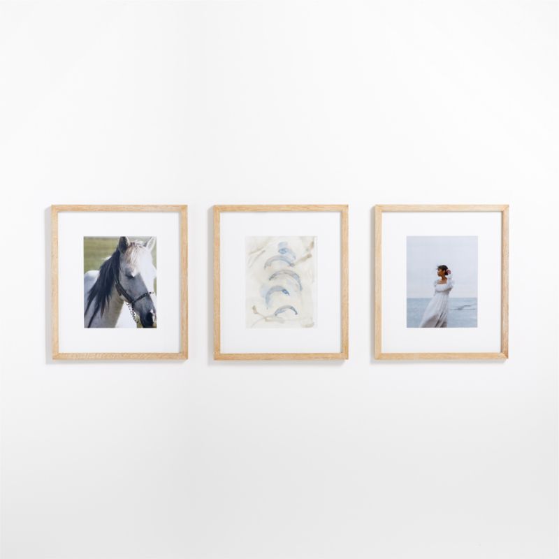 Create an instant gallery wall with this three-frame set. Our solid oak frames add organic warmth to photo displays with their flowing grain and off-white mats. A Crate & Barrel exclusive, the trio of 11"x14" light oak wood frames can be displayed in a vertical or horizontal line or arranged as a staggered gallery wall.