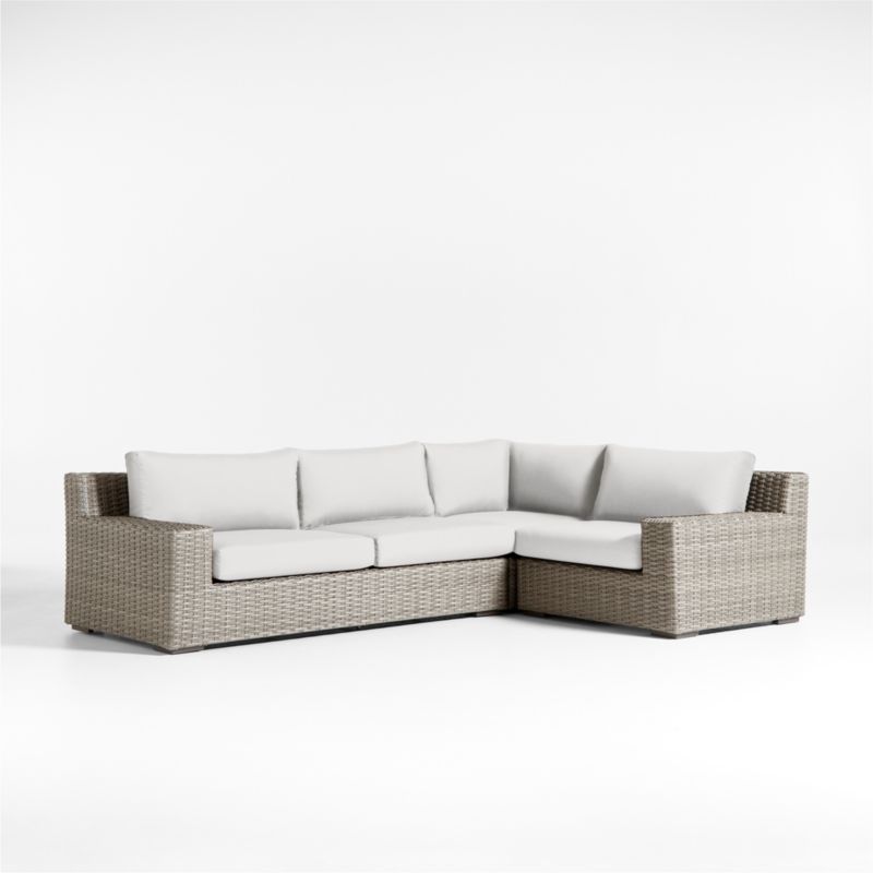 Low-slung and ready to lounge, our Abaco petite outdoor sectional sofa extends an invitation to kick back and relax. Comprising a right-arm chair, corner and left-arm sofa, the L-shaped sectional offers a deep seat and wide, boxy arms perfect for a cool drink. Handwoven with a chunky, textural weave, the weather-resistant resin wicker exhibits a variety of grey-brown shades to replicate the nuanced color of well-worn rattan. Sand-colored cushions covered in fade-, stain-, water- and mildew-resistant Sunbrella acrylic add an extra layer of comfort.