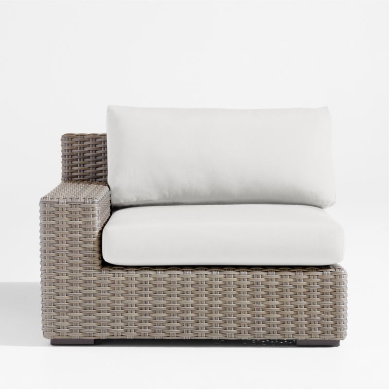 Low-slung and ready to lounge, our Abaco outdoor sectional collection extends an invitation to kick back and relax. Each left-arm lounge chair is handwoven in grey-brown, weather-resistant resin wicker in a chunky, textural weave. The chair's modern, boldly proportioned frame of lightweight aluminum offers a deep seat and a wide, boxy arm that's perfect for hosting a cool drink. Neatly tailored with bullnose fronts and boxed sides, the off-white seat and back cushions add on a layer of comfort covered in fade-, stain-, water- and mildew-resistant Sunbrella acrylic. The left-arm lounge chair with cushions combines with other Abaco sectional components to fashion outdoor seating tailored to your great outdoors.
