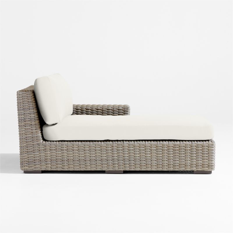 Low-slung and ready to lounge, our Abaco outdoor sectional collection extends an invitation to kick back and relax. Each right-arm chaise is handwoven in grey-brown, weather-resistant resin wicker in a chunky, textural weave. The lounge chaise's modern, boldly proportioned frame of lightweight aluminum offers a deep seat and a wide, boxy arm that's perfect for hosting a cool drink. Neatly tailored with bullnose fronts and boxed sides, the off-white seat and back cushions add on a layer of comfort covered in fade-, stain-, water- and mildew-resistant Sunbrella acrylic. The right-arm chaise with cushions combines with other Abaco sectional components to fashion outdoor seating tailored to your great outdoors.