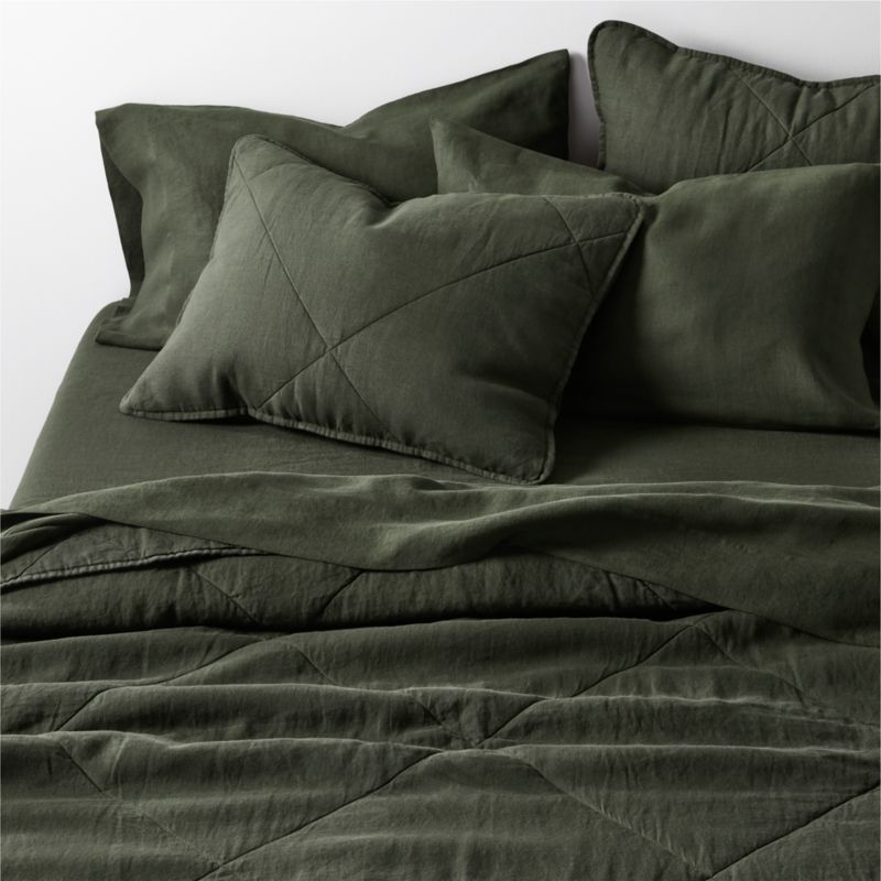 Our Aire Natural collection makes a laid-back bed dressed in cool-to-the-touch linen that sleeps cozy. The sustainably sourced fiber weaves a quilt in a dark green-grey that serves as a sophisticated neutral. Stitched on the diagonal with oversized, off-center diamonds, the soft bedspread updates quilting for the modern bedroom. Pair the effortlessly chic quilt with our other linen bedding in the same deep hue, or mix and match to keep the look fresh.