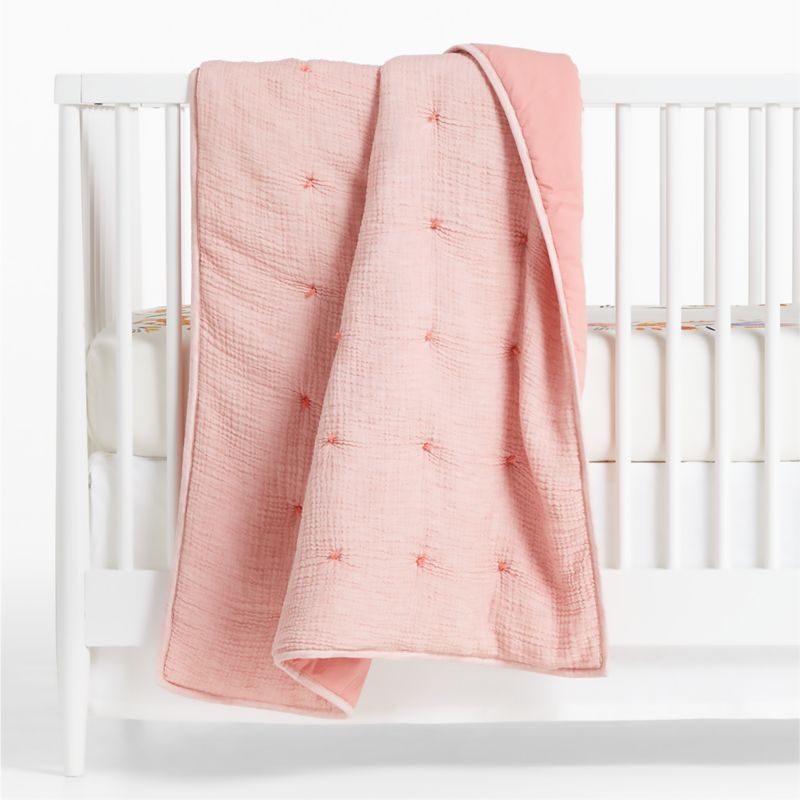 Soft and airy, like curling up in a cloud. Our cotton crib quilt features a double layer of gauzy crinkle fabric on the front accented with delightful thread tufts to add to the cozy factor. A smooth cotton-linen reverse and self piping around the edges gives the quilt a tailored finish. Pair the pink quilt with your favorite fitted crib sheet for a snuggly look.