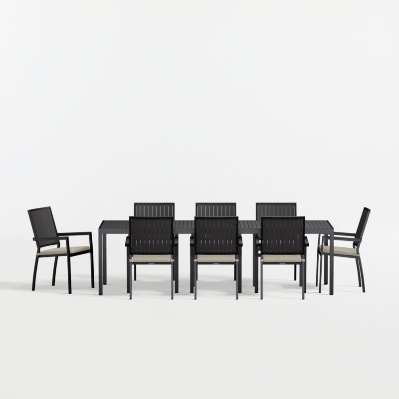 Easy, breezy Alfresco has a contemporary look that always feels fresh. Well-made with waterproof materials, it's designed to welcome warm-weather entertaining season after season. The dining table and chair set is made of rustproof aluminum twith faux wood slats that emulate the look of real wood is finished in a durable black powdercoat. Seat cushions are covered in Sunbrella fabric, an unrivaled outdoor performance material.