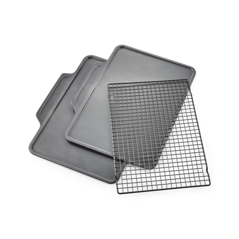 Bake multiple batches of snickerdoodles, blondies and chocolate chip cookies with this helpful three-piece set. Constructed of heavy-gauge aluminized steel, the two cookie sheets promote even baking and browning, while the rack allows cookies and other baked goods to cool quickly and crisp perfectly. Coated in a ceramic-reinforced non-stick finish, the durable pan and rack release cookies easily and resist scratches. Oversized, angled handles provide a safe grip even when you're wearing oven mitts.