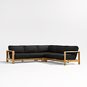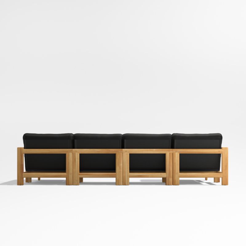 Our Anguilla double-chaise sectional is a beautiful, worry-free place to spend your lazy days. Exceptionally durable solid teak frames the sofa's angular silhouette, while thick, comfortable cushions covered in weather-resistant upholstery lull you into warm-weather bliss. The four-piece sectional sofa—right- and left-arm chaises and two armless chairs—is crafted with roomy seats, solid construction and sleek lines for ideal patio or poolside lounging.
