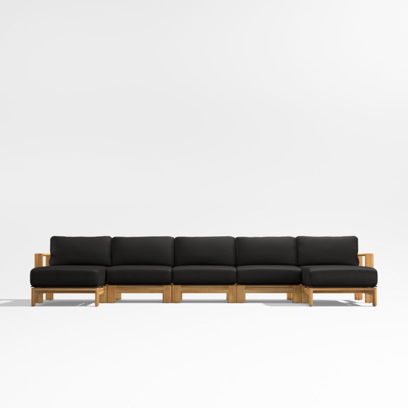 Our Anguilla double-chaise sectional is a beautiful, worry-free place to spend your lazy days. Exceptionally durable solid teak frames the sofa's angular silhouette, while thick, comfortable cushions covered in weather-resistant upholstery lull you into warm-weather bliss. The five-piece sectional sofa—right- and left-arm chaises and three armless chairs—is crafted with roomy seats, solid construction and sleek lines for ideal patio or poolside lounging.