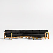 Our Anguilla five-piece sectional is a beautiful, worry-free place to spend lazy days outdoors. Exceptionally durable solid teak frames the sofa's angular silhouette, while thick, comfortable cushions covered in weather-resistant upholstery lull you into warm-weather bliss. The L-shaped sectional —right- and left-arm sofas, two armless chairs and a corner—is crafted with roomy seats, solid construction and sleek lines for ideal patio or poolside lounging.