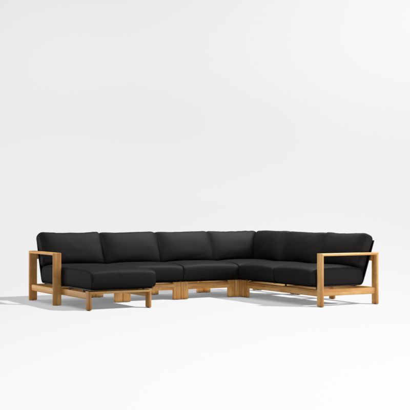 Our Anguilla sectional is a beautiful, worry-free place to spend lazy days outdoors. Exceptionally durable solid teak frames the sofa's angular silhouette, while thick, comfortable cushions covered in weather-resistant upholstery lull you into warm-weather bliss. The five-piece sectional sofa—right-arm sofa, left-arm chaise, two armless chairs and a corner—is crafted with roomy seats, solid construction and sleek lines for ideal patio or poolside lounging.