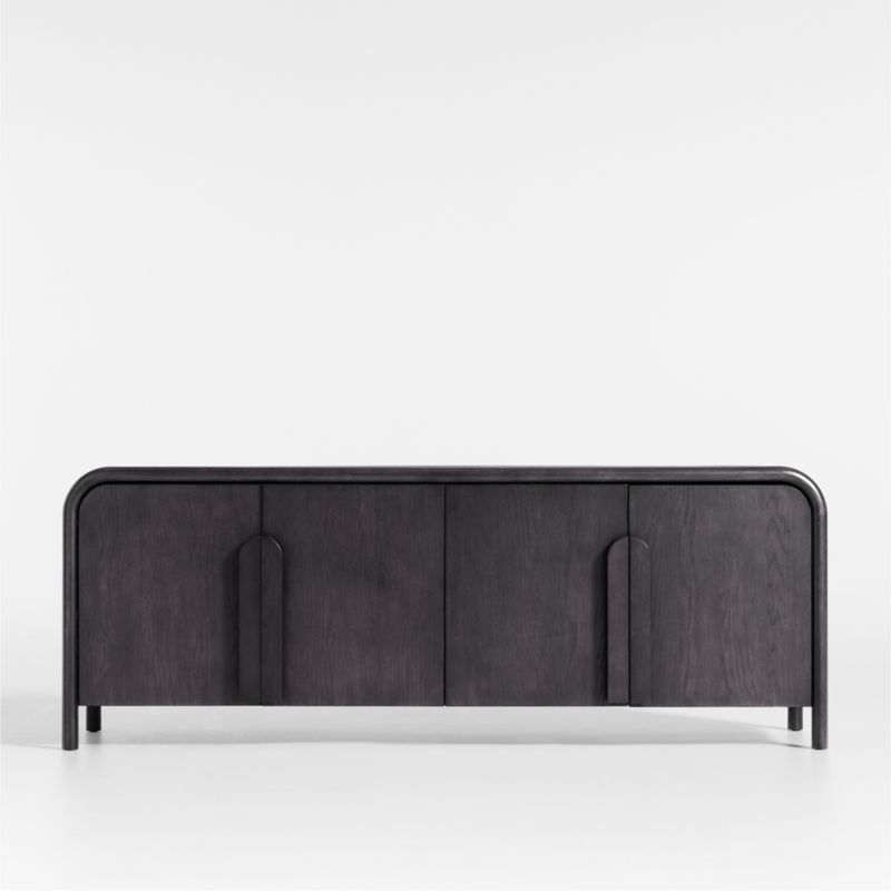 The traditional console takes a contemporary turn in Annie. Made of solid oak and oak veneer finished in dark charcoal, the console showcases a rounded silhouette. Bentwood poles flow a continuous arc from leg to leg, framing two cabinets with flat-front doors that show off the wood grain. Cleanly integrated into the arcing design, long, rounded pulls open to reveal one adjustable shelf per cabinet for storing table linens, audio equipment or dining room serving ware.