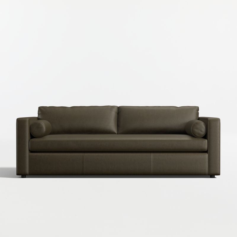 Aris makes modern design soft, cozy and indulgent, upholstered in top-grain leather with rich color and buttery softness. Destined to be everyone's favorite spot to chill, clean-lined Aris features track arms and a broad deck with deep seat and plush back cushions that invite the gang to get comfortable. A couple of bolster pillows aid in getting the snuggle just right.