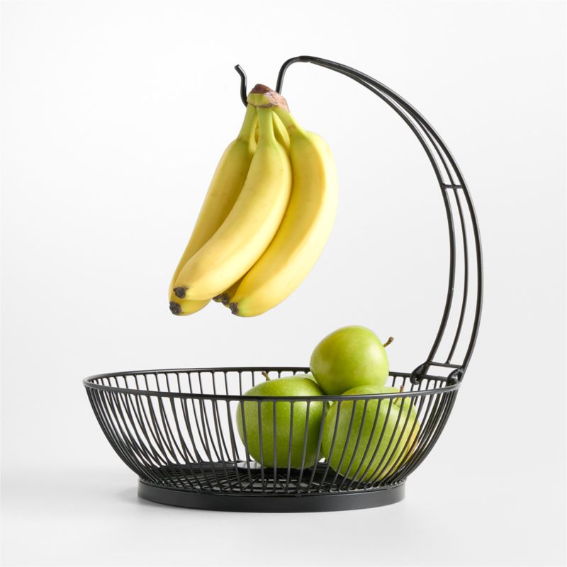Transform your grocery store or farmers market produce into an enticing still-life with our Arlo fruit basket and its gracefully arched banana hanger. Finished in modern matte black, slender iron wires curve a graphic, rhythmic frame for colorful fresh fruits. The airy basket unites even the most disparate collections of fruits and vegetables while a bunch of bananas ripens above.