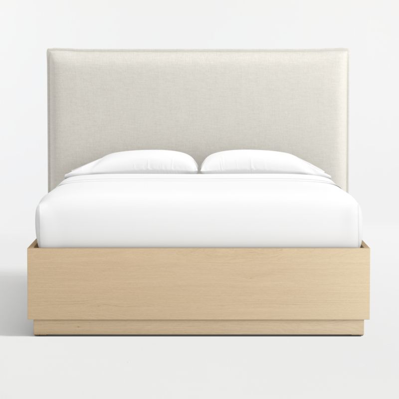 Our custom bed collection lets you mix and match our top-selling headboards and bases for a look that's truly yours. Our coastal-cool Arvada headboard offers pillow-like comfort and the casual look of a relaxed flange border. The Batten bed base complements Arvada's clean-yet-relaxed silhouette with a sleek plinth design and the lively grain of oak veneer enhanced with a white oak finish. A great choice for storage-challenged bedrooms, the base seamlessly integrates a drawer at the foot of the bed for placing bedding, blankets and off-season garments.