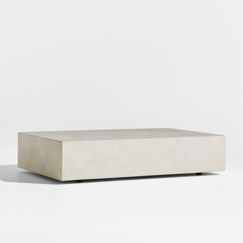 Made entirely of cast-concrete tiles, our Avalon outdoor coffee table delights the eye with the warm nuanced tones of a sandy beach. Two sizes of tiles provide even more interest, lending dynamic pattern to the rectangular silhouette. Floating on a recessed plinth base, the low-profile coffee table elevates outdoor—or indoor—living spaces with elegant minimalism and a beautifully neutral palette.