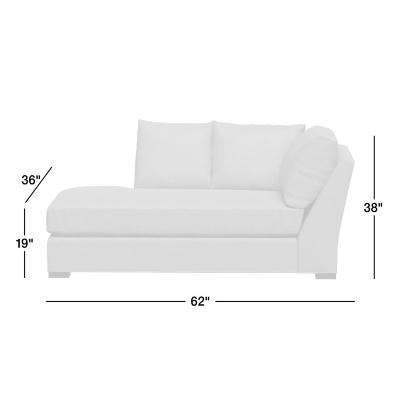 Axis Classic Left-Arm Storage Chaise Lounge Sectional Piece32"Hheight36"Wwidth62"DdepthMeasurements are in inches.81.28Hheight91.44Wwidth157.48DdepthcmMeasurements are in centimeters.