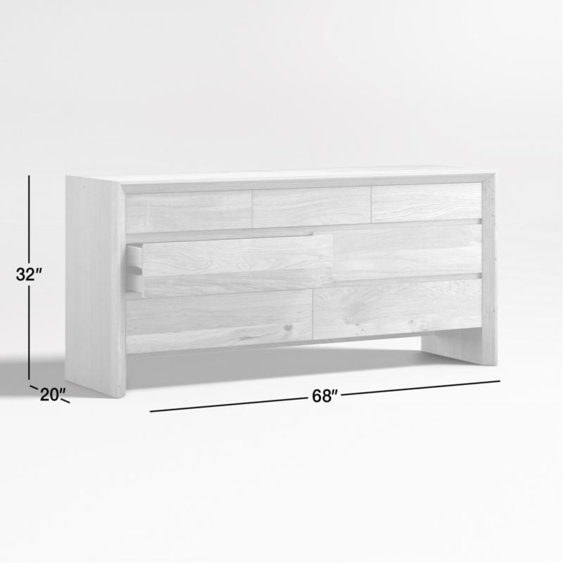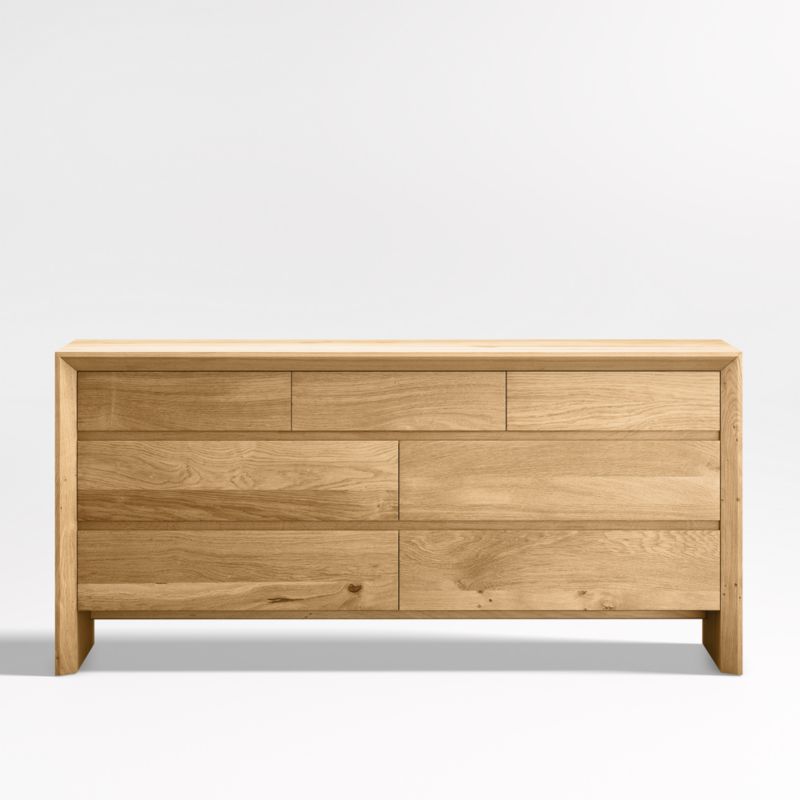Named after the natural beauty found in the Baja Peninsula, this bedroom dresser celebrates the organic richness of solid white oak. Simple geometry and a natural stain put the focus on the wood's unique grain, knots and markings. Reverse chamfer edges bring dimension to the clean waterfall silhouette, while seven drawers—three small and four large—devote their clean, flat fronts to the wood's lively grain and warm color. Rustic and timeless, the Baja natural oak dresser is a Crate & Barrel exclusive.