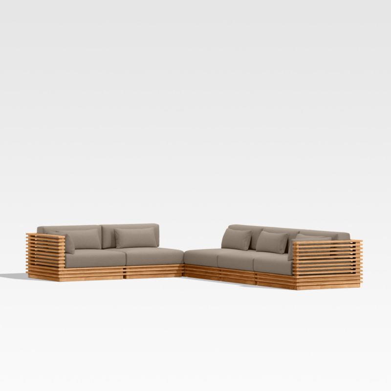 Modern and made for the outdoors, Batten's modular design flexes with your space and entertaining style. Crafted of sustainably sourced, unfinished solid teak, it is built to last a lifetime. The sectional's bold slats, striking linear profile and minimalist silhouette give it a distinctly modern look. A cozy mix of plush seat, back and lumbar cushions plus throw pillows provides unrivaled comfort and can all be upholstered in a weather-resistant fabric of your choice.