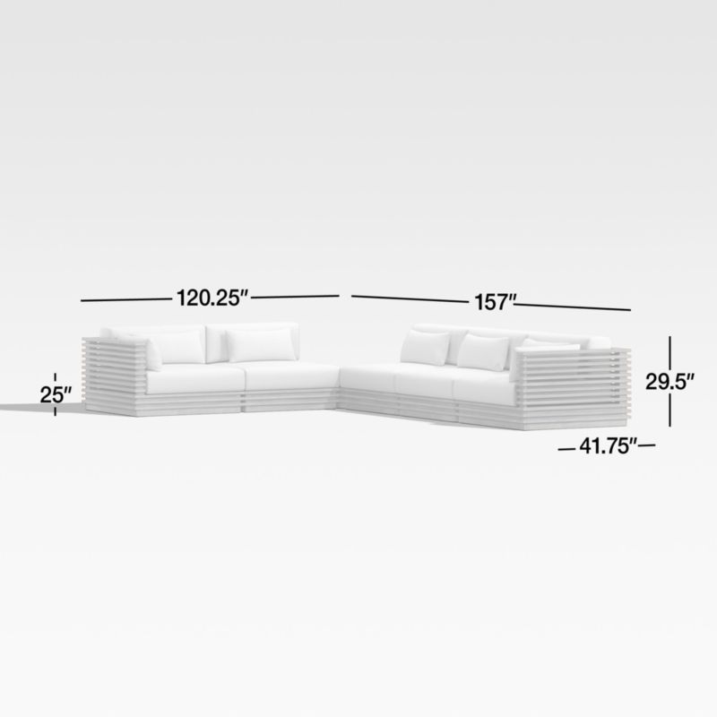Batten Natural Teak 6-Piece L-Shaped Outdoor Sectional Sofa with Corner Coffee Table & Cast Shale Brown Sunbrella ® Cushions29.5"Hheight157"Wwidth120.25"DdepthMeasurements are in inches.74.93Hheight398.78Wwidth305.44DdepthcmMeasurements are in centimeters.