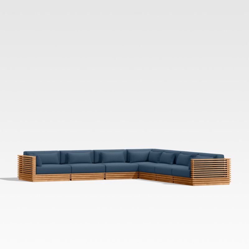 Batten Natural Teak 7-Piece L-Shaped Outdoor Sectional Sofa with Cast Harbor Navy Blue Sunbrella ยฎ Cushions