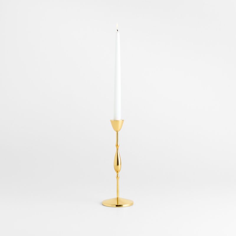 Our take on traditional ornate candlesticks, this taper holder stretches and streamlines the classic silhouette into something sculptural and abstract. Crafted of cast brass, the candlestick evokes drops of molten gold. We especially love the way candlelight gleams on the highly polished finish. Pair the small beaded taper holder with the larger coordinating candlesticks to set the table with modern glam.