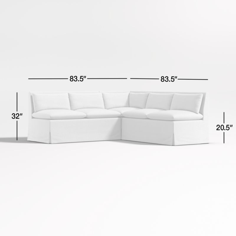 Made for lingering, our Belmar modular seating takes a breezy approach to mealtime. Pitched back to relax the back, the corner and two bench banquettes layer on comfort with pillow backs and seat cushions. The linen-like performance fabric that handles the occasional spill, and slipcovers keep the look neat with a snug fit and inverted pleats for a bit of understated tailoring. The three-piece, L-shaped dining banquette provides a flexible approach to kitchen or dining room seating.