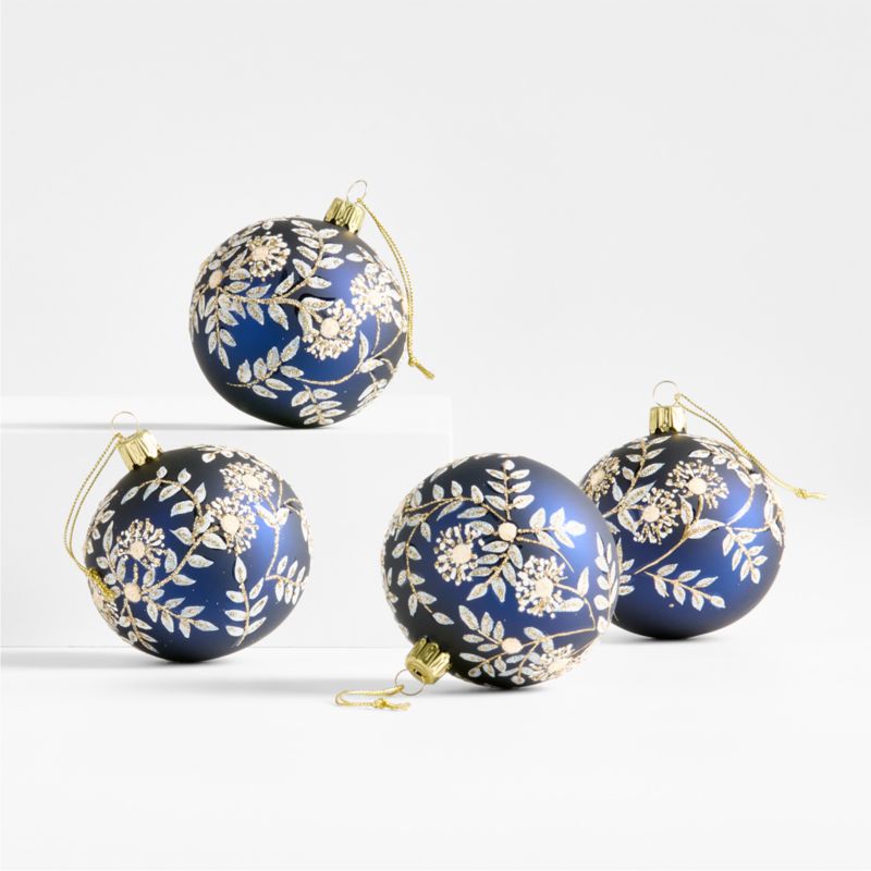 Our botanical ball ornaments dress your Christmas tree with exquisite artisanship. Hand-blown by talented craftspeople, the glass spheres are painted by hand with effusive vines, leaves and flowers in cream on sapphire blue. Gold glitter details sparkle in the glow of string lights. These four gorgeous ornaments are perfect for a formal tree with Old World glamour.