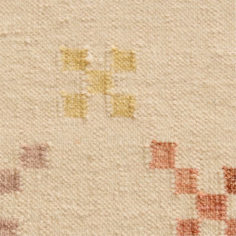 Our Broderie kilim rug by designer Louise Roe combines the versatility of a solid floorcovering with the personality of a patterned piece. In a rich, warm palette, the rug is finished with a cross-stitch-inspired border for a hit of playfully traditional charm. The wool and Tencel blend is both durable and delightful underfoot.