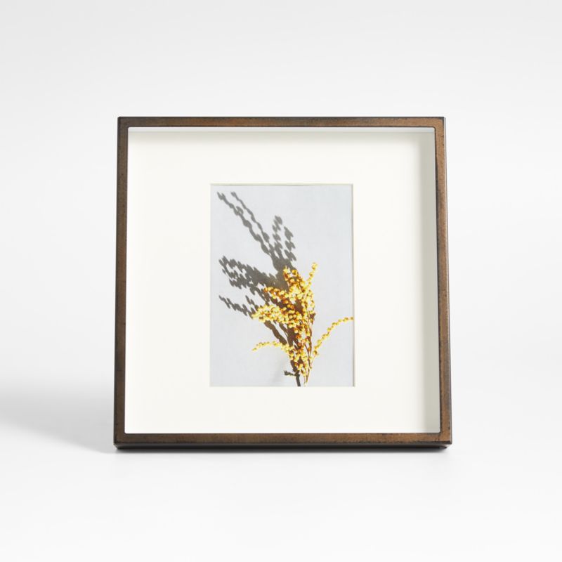 Our brushed antique bronze frame adds drama to photo displays with its shadow-box styling and oversized off-white mat. A Crate and Barrel exclusive, our square 5x7 frame can be displayed on the wall or tabletop.