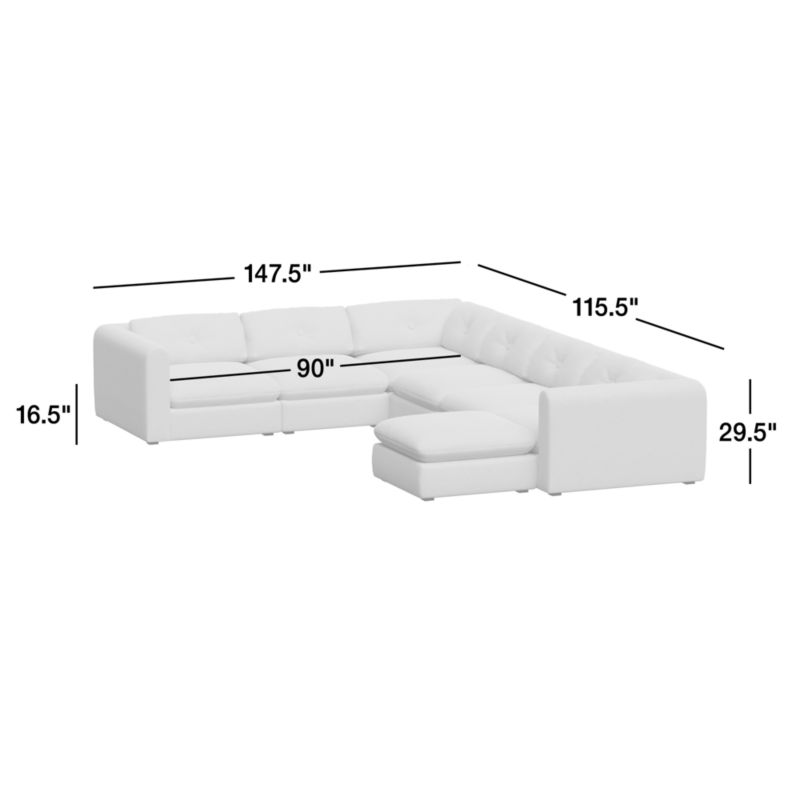 As cool and casual as its namesake Chicago neighborhood, our Bucktown sectional invites the whole family to curl up and snuggle in. Propped on a thick deck, the sectional sofa's rounded seat cushions sit deep, plush and loungey. Toss off the back pillows and it's deep enough to sleep an overnight guest. And because it's a Crate & Barrel exclusive, Bucktown delights with attention-getting design details such as oversized button tufting on the back pillows and the waterfall construction that grounds the modular sofa in contemporary curves. The seven-piece sectional consists of an ottoman, three armless chairs, a corner and right- and left-arm chairs.