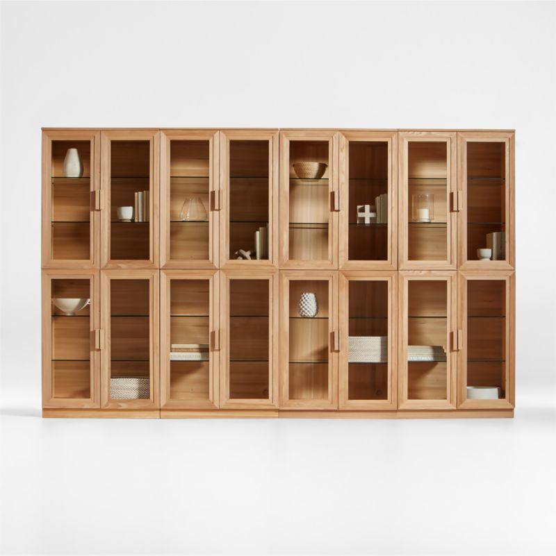 Inspired by vintage barrister cabinetry, our Calypso collection opens up living room storage with a light and airy look. This arrangement unites four sets of double-stacked glass-door bookcase hutches to create a wall of see-through display of dinnerware, decorative objects and books. Detailed with stepped trim, the elm wood frames are heavily wirebrushed and given a natural finish to bring out the wood grain. Recessed plinth bases and blocky pulls add modern details to this timelessly styled wood storage configuration, a Crate & Barrel exclusive.