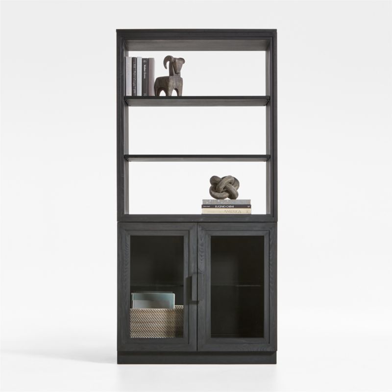 Inspired by classic barrister cabinetry, our Calypso collection opens up living room storage with a light and airy look. Elm wood frames each piece in this roomy configuration with stepped trim and black finish to bring out the grain. The two-piece unit places a bookshelf hutch atop a glass-door cabinet base for a mix of open and closed storage of books, media components and collectibles. A recessed plinth base and blocky pulls add modern details to this timelessly styled black storage configuration, a Crate & Barrel exclusive.