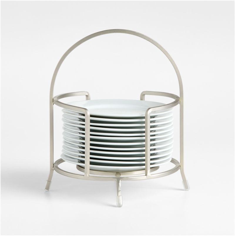 Handy for buffets or informal dessert service, our Cambridge stand stacks 12 white porcelain appetizer plates in a simple metal stand. Perfect for holiday parties, birthday gatherings or cocktail hour, the set is portable and space-saving.