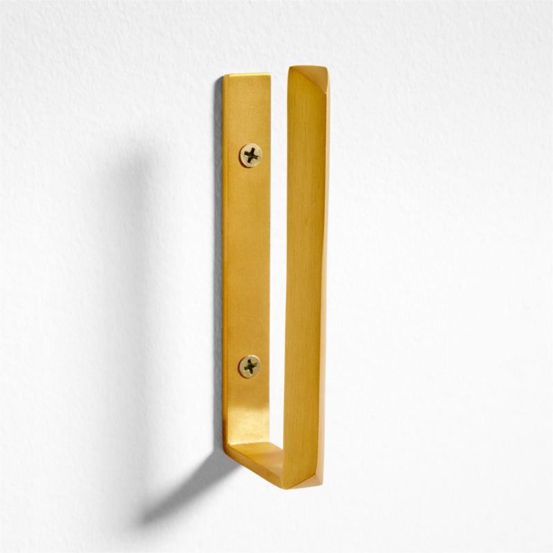 Sculptural and striking, our Captiare hook accommodates the puffiest parkas, widest-strapped purses and fluffiest scarves. Gleaming brass bends a faceted U shape that adorns the wall like modern jewelry when not in use. The hook itself mirrors the height of the wall bracket for a unique, graphic look and a secure grip on coats, bags and accessories. Outfit a coordinated bedroom with our triangle hardware collection on the dressers and our exclusive triangle brass wall hook holding a robe next to the bed.