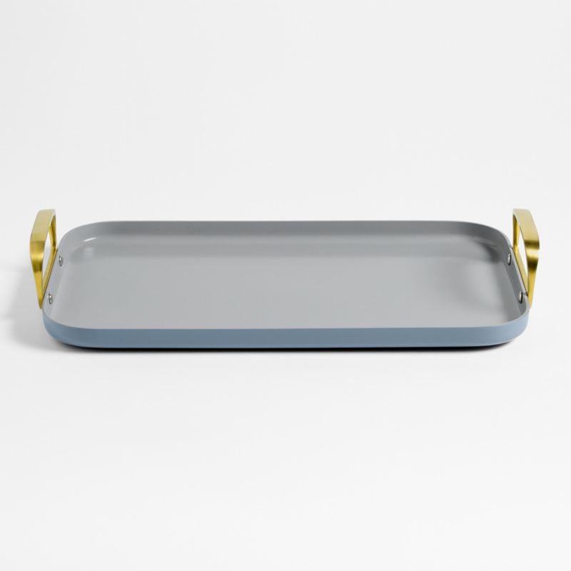 Caraway's modern, minimalist cookware in a blue inspired by serene lagoons that you'll only find at Crate & Barrel. Adorned with gleaming gold-finished handles that add a subtle touch of glam, this display-worthy double-burner griddle is a joy to cook with. The aluminum pan conducts heat evenly and efficiently, while the ceramic coating provides superior non-stick performance. Stretching across two burners, our exclusive griddle offers plenty of space for pancakes and bacon or burgers and sauteed onions.