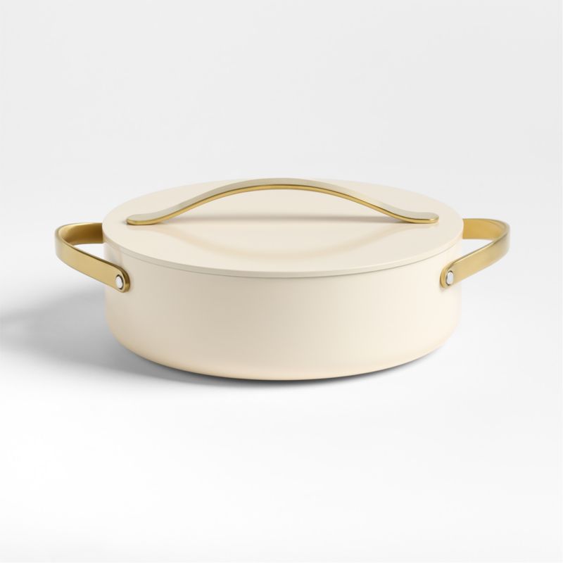 You'll be smitten with this subtly glam rondeau pan that's as lovely to look at as it is to use. Featuring gold-finished stainless steel handles and a creamy exterior, our exclusive lidded brasier goes from stove to oven to table to serve one-pot meals. The double layer of ceramic coating provides superior non-stick performance while holding heat efficiently, and the high, straight walls allow for mess-free simmering, braising and frying.