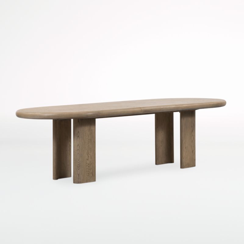 Our Carrington expandable dining table flows a striking design with rounded edges and the beauty of yucca oak. Plank legs take a slight curve at the outer edges, echoing the elongated oval top. The expansive dining surface, wide legs and natural finish perfectly showcase the wood's dramatic cathedral graining. A great choice for entertaining, the extension table includes a removable leaf that expands seating from 6 to 8.