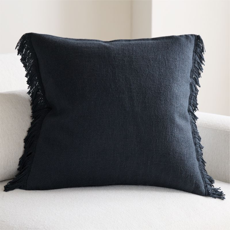 An irresistibly soft and slubby weave gives this throw pillow a relaxed look and feel that you'll want to snuggle up with every day. The inclusion of silky viscose adds a sophisticated sheen to the organic beauty of sustainably sourced linen fibers. Yarn-dyed deep indigo, the fringed pillow looks chic and casual tossed on a sofa, armchair or bed-especially paired with the coordinating throw blanket. Our exclusive blue pillow includes your choice of a plush feather-down or lofty down-alternative insert.