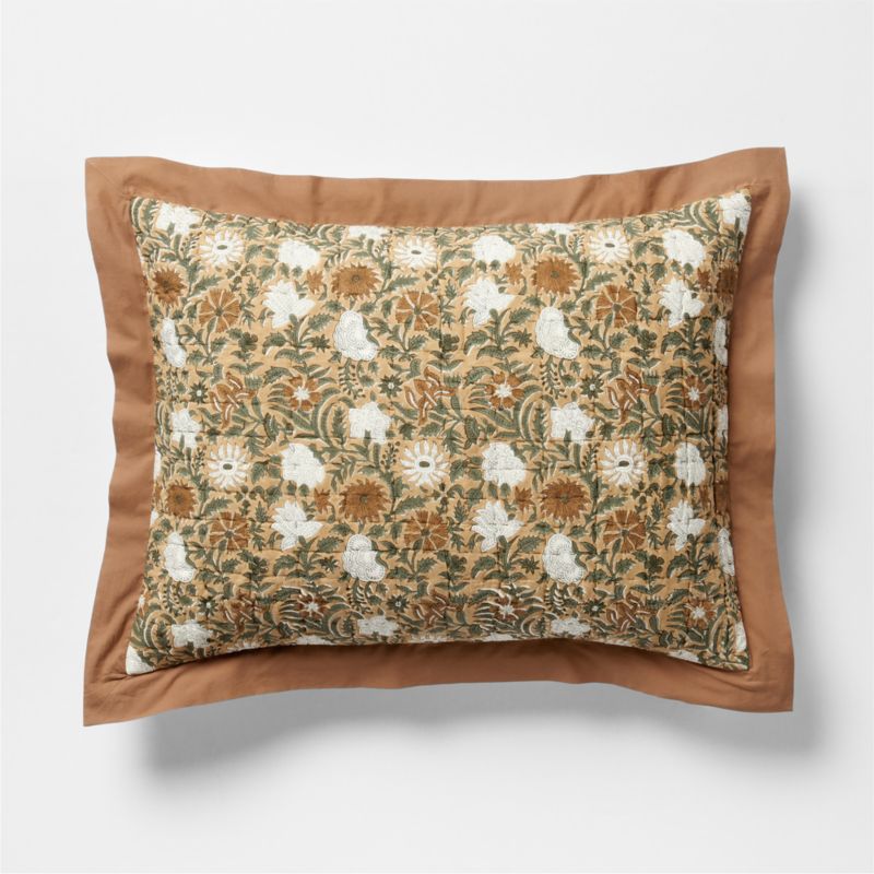 Inspired by vintage wallpaper, our Celeste sham layers on pattern with intricate florals and an heirloom vibe. Skilled artisans print the flourishing botanicals by hand using traditional blocks, creating depth and fascinating variations in the desert-inspired design. The printed organic cotton is then quilted by hand and finished with generous borders in toasty taupe. Charming variations in the printing—one of our favorite aspects of this intensive craft—make each pillow sham beautifully unique. Add the matching quilt to complete the modern-homespun look.