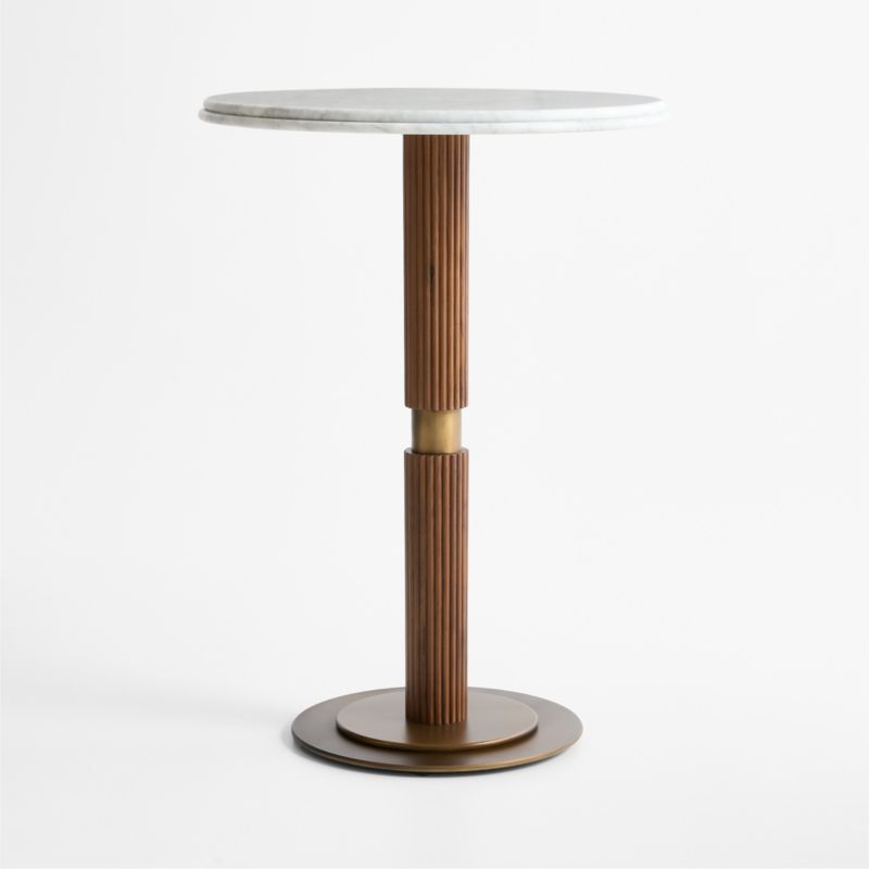 Exquisite materials and dimensional detailing accentuate the modern simplicity of our Chelsea dining table. A double bullnose edge puts the focus on the gorgeous veining of the round Carrara marble top. Set on a circular stepped base, the columnar pedestal is made of natural-finished walnut with vertical ribbing and an inset collar of burnished brass. Perfect for high dining, the bar-height table seats up to three.