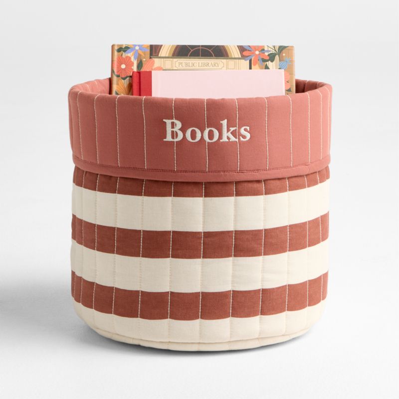 Our Colcha quilted bin by designer Louise Roe makes organization easy—and really quite adorable. Placed on the floor in a nursery or kid's bedroom, the bin provides a place to quickly corral and organize books, stuffies and other toys. The rich rust and cream-colored stripes work with just about any color scheme, but they coordinate especially well with our Colcha green floral bin (sold separately) for some whimsical pattern play.