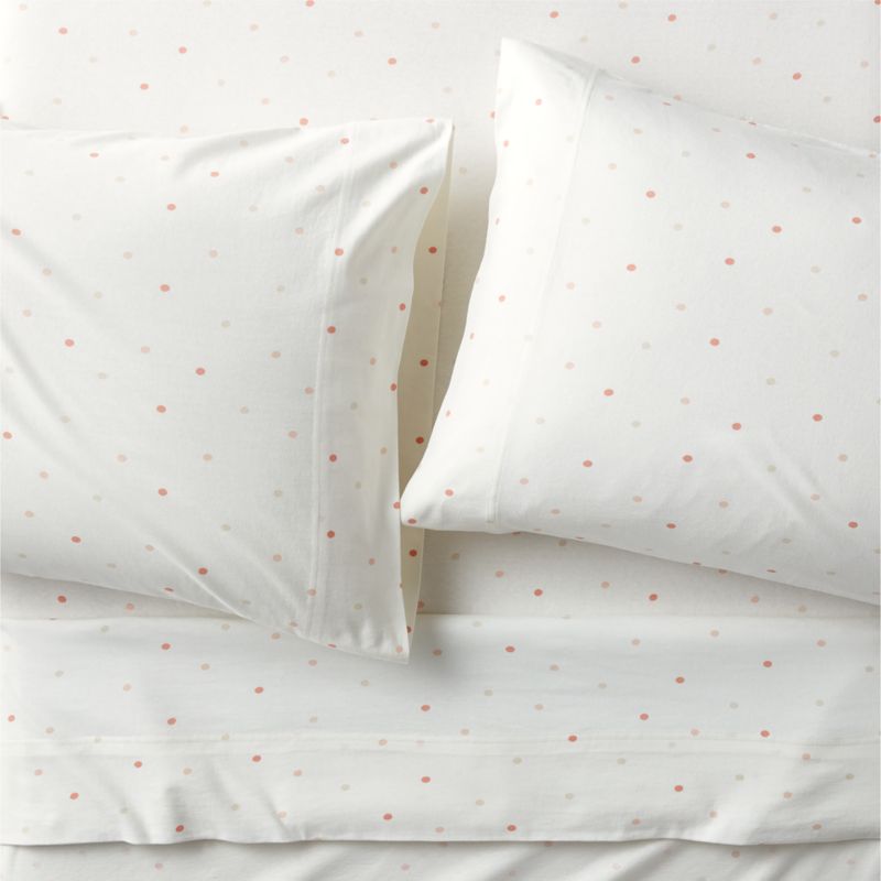 Softer than their favorite tee, cooler than the average cotton sheets and yarn-dyed for long-lasting color, our Organic Cotton Jersey Sheet Set just changed the bedding game. And by choosing organic cotton, you're helping create a better future for your kids: Compared to conventional cotton, it can reduce CO2 by 46%, energy consumption by 62% and irrigated water consumption by 90%. Kids and parents alike will love the warm sunrise tones of these polka dot sheets. Mix and match to your heart's content with the rest of our Organic Cotton Jersey Bedding Collection in a range of richly hued solids and stripes.