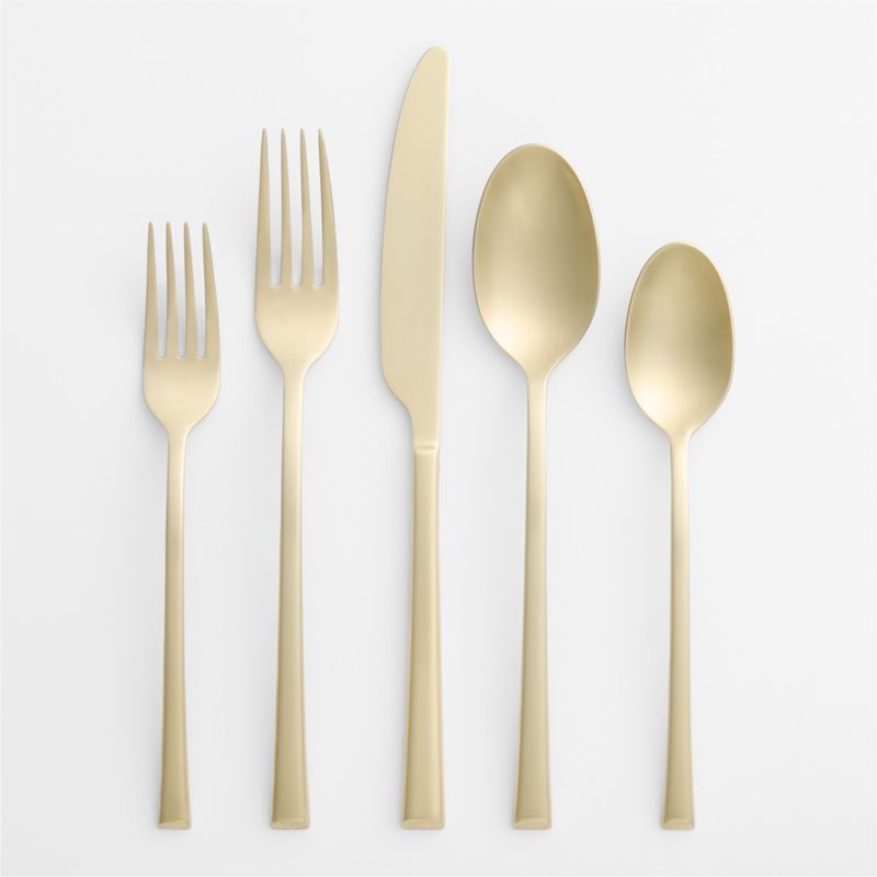 Finished in luxe champagne, the long, slender handles of our Cortland flatware arch gently to squared-off ends. The warm satin finish balances their modern, streamlined forms for a set that adds a touch of glamour to tables both casual and formal. A Crate and Barrel exclusive, each of the five-piece stainless steel place settings in soft gold includes a dinner fork, salad fork, dinner spoon, teaspoon and dinner knife.