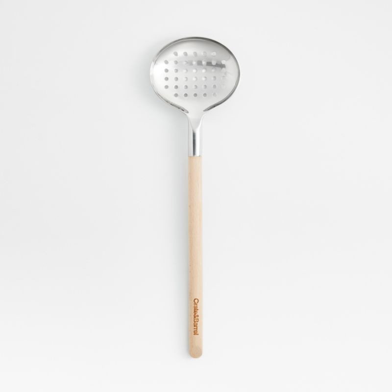 Stir, scoop and serve dumplings, pasta and peas with our signature beechwood and stainless steel slotted spoon. The essential utensil ably handles boiled potatoes and pot roast, while the grid of perforations allows liquids to drain away. The sleek stainless steel head stands up to heat, while sustainable beech shapes a cylindrical handle for a sturdy grip and a modern organic look. We love the way the refined beveled edge finishes the elongated handle with a dynamic detail. Combine the slotted spoon with the other exquisitely proportioned utensils in our exclusive Crate & Barrel collection for a well-outfitted workspace that's up to any cooking challenge.