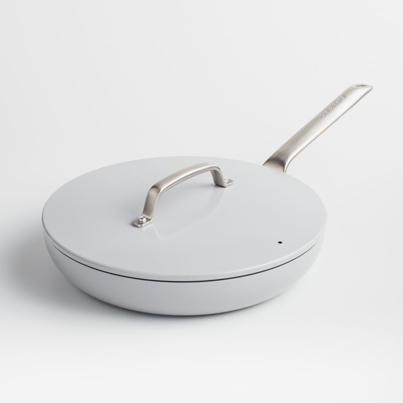 Our exclusive cookware collection has been scrutinized at every stage to bring you the heirloom quality and refined look your kitchen deserves. Made of specially treated EvenCook Ceramic™ hard-anodized aluminum, the pale-grey skillet provides even heat control for superior performance. Ideal for browning and searing with less oil, the non-stick cooking surface has a diamond-infused ceramic coating that effortlessly releases foods and cleans up easily. The ergonomically considered handle stamped with the Crate & Barrel logo feels comfortable and balanced and is secured with smooth-profile rivets for easy cleaning. Ideal for browning and searing, the grey lidded frying pan is also oven- and broiler-safe to 500°F.