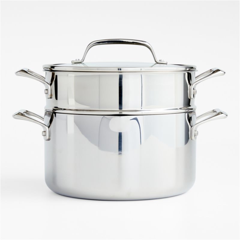 Our exclusive cookware collection has been scrutinized at every stage to bring you the heirloom quality and refined look your kitchen deserves. The pot's five-ply construction wraps the copper EvenCook Core® in layers of aluminum and stainless steel for precision heat control and professional results. Stamped with the Crate & Barrel logo, the ergonomically considered handles feel comfortable and balanced, and are secured with smooth-profile rivets for easy cleaning. The multi-purpose pot has a glass lid that lets you check on your meal's progress with a built-in strainer for draining.