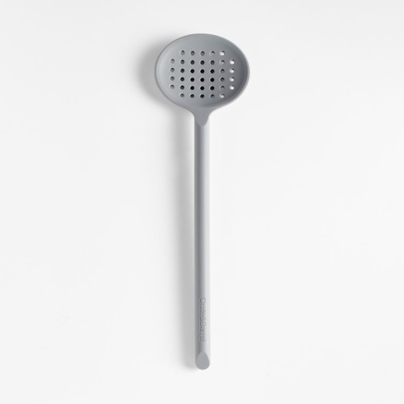 Stir, scoop and serve dumplings, pasta and peas with our signature grey silicone slotted spoon. Constructed with a nylon core for strength, the grey silicone utensil ably handles boiled potatoes and pot roast, while the grid of perforations allows liquids to drain away. Soft-touch silicone won't damage non-stick pans and resists stains, scratches and heat up to 600 degrees. We love the way the refined beveled edge finishes the elongated handle with a dynamic detail. Combine the dishwasher-safe slotted spoon with the other exquisitely proportioned utensils in our exclusive Crate & Barrel collection for a well-outfitted workspace that's up to any cooking challenge.