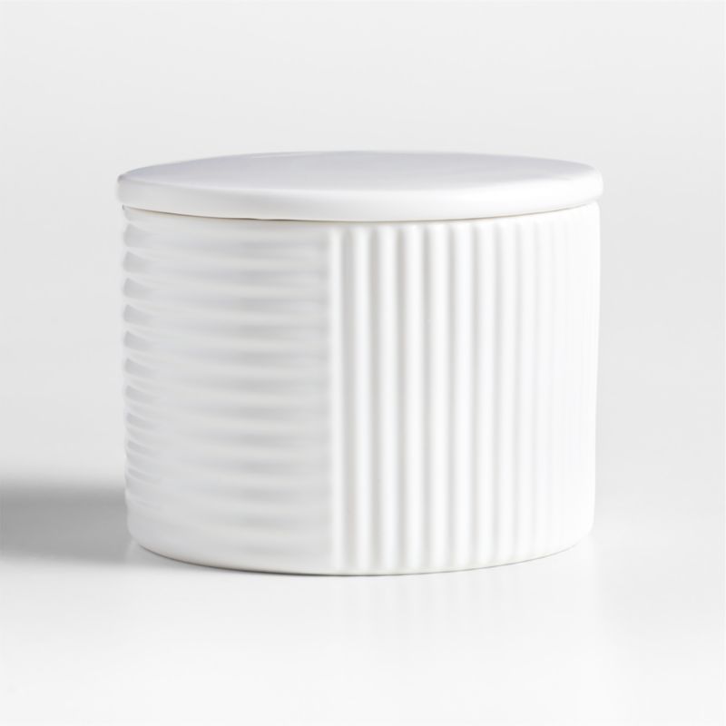 Inspired by the bowls in our Hanno collection, this butter keeper exhibits the same fresh white finish and dynamic combination of horizontal and vertical ribbing. The durable porcelain vessel is textured all over with slender fluting for multidirectional linear interest. An ingenious way to store butter, the butter keeper safely keeps butter at room temperature and ready for spreading. Simply pack the lid with one stick of softened butter, add water to the fill line on the base and place the butter-filled lid upside-down in the base to create an airtight seal of water that protects flavor and freshness. For best results, change water every three days.