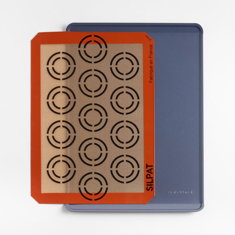 Bake cookies effortlessly with our exclusive set. Our cookie sheet in gorgeous slate blue is part of our bakeware collection that takes its cue from professional kitchens. Made of carbon steel—an alloy of 99% iron and 1% carbon that's nearly indestructible—the pan heats quickly and evenly for consistent baking and perfect browning. Reinforced rims prevent warping, while two flat sides allow baked cookies to slide right off . Designed to bake without parchment, butter, oil or spray, Silpat's ingenious mat bakes cookies evenly and releases them easily. Simply place the pan on our cookie sheet, add dough and bake as usual. Made with food-grade silicone and reinforced fiberglass mesh, the cookie mat cleans up easily in the dishwasher.