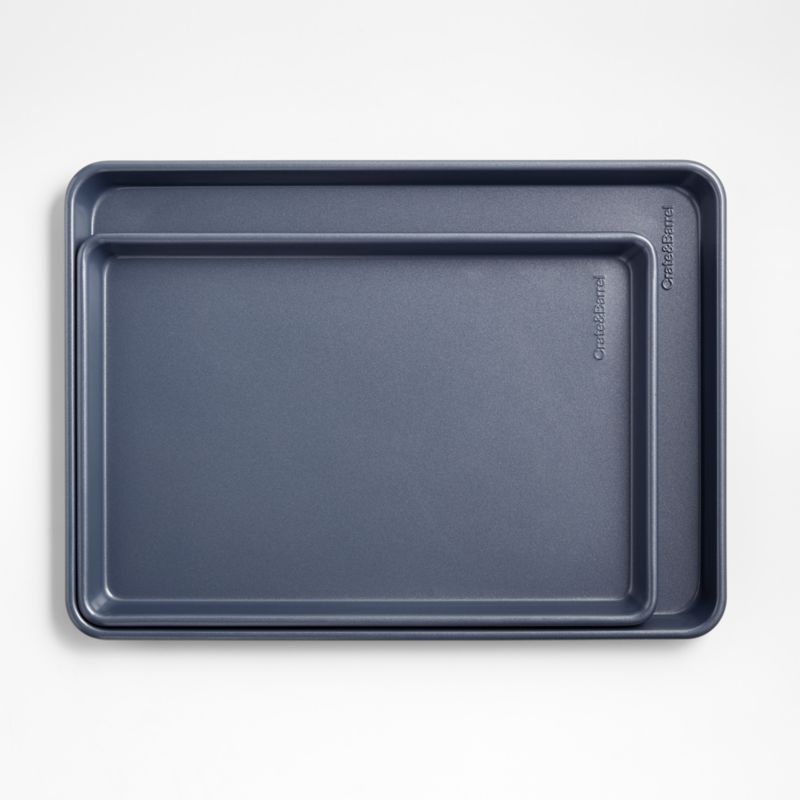 Super durable, lighter than cast iron and oh, that gorgeous unexpected slate blue. Perfect for batches of cookies and one-pan meals, our set of slate blue sheet pans is part of our exclusive bakeware collection that takes its cue from professional kitchens. Made of carbon steel—an alloy of 99% iron and 1% carbon that's nearly indestructible—the two baking sheets heat quickly and maintain consistent temperatures for perfectly browned and crisped foods. A double layer of silicone-based non-stick coating ensures easy release and quick cleanup.