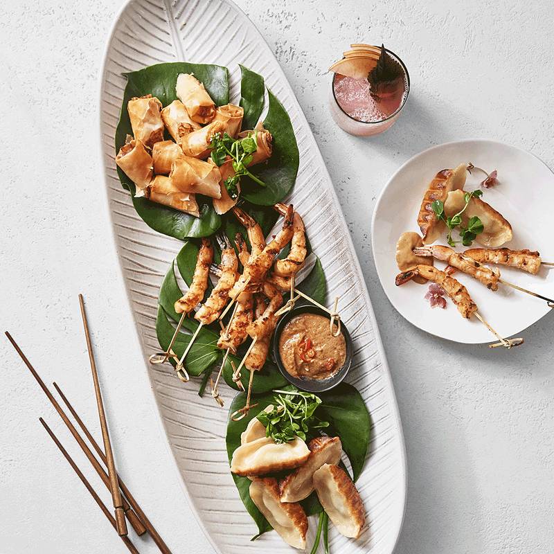 - Prepare a grill to high heat. Thread the shrimp onto wooden or metal skewers, about 4 shrimp to a skewer. Grill until shrimp are opaque throughout, about 4 minutes per side. Transfer to a serving platter, garnish with scallions and serve with peanut sauce on the side.