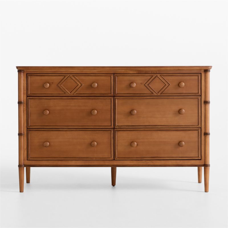 Inspired by Victorian English furniture, designer Louise Roe created a dresser that has all the presence and character of an antique find. With its carved-diamond details, faux-bamboo legs and antiqued staining, our Crosby wood dresser is a for-a-lifetime piece you'll use far beyond the nursery years. Six spacious, smooth-gliding drawers make it a one-stop storage spot. Pair it with other pieces from our Crosby collection for a cohesive look.